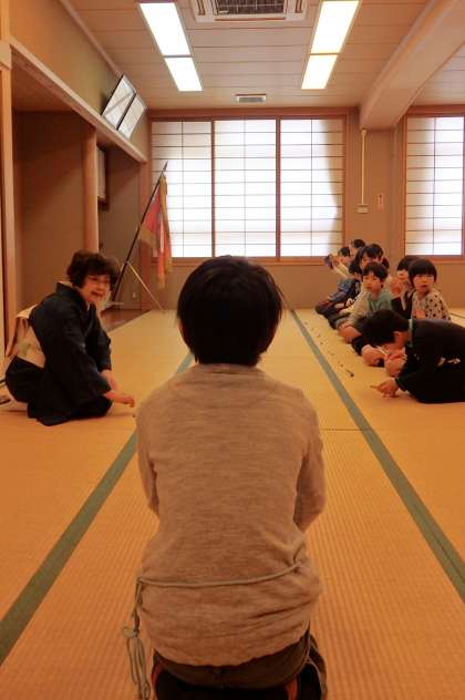 後半は高学年の部。今回は,6年生の今までの練習の成果を披露してもらおうということで,お手前のセットも用意しました。お茶の先生に続いて,さっとお座敷入りを済ませます。