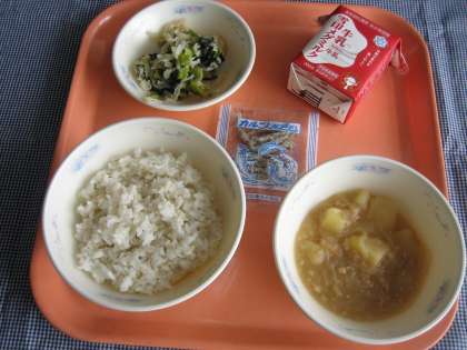 麦ごはん・牛乳・じゃがいものそぼろ煮・切干大根の煮つけ・じゃこ