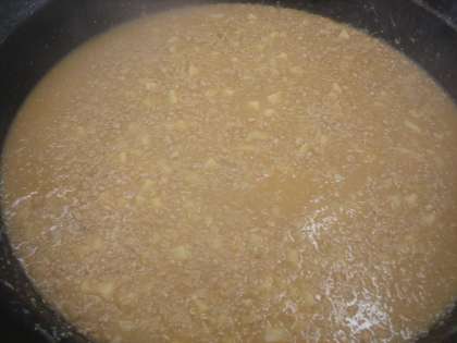 「じゃがいものそぼろ煮」はしょうがで香りをつけた油で鶏ひき肉を炒めて玉ねぎ・じゃがいも・下茹でしたこんにゃくを炒めて定量の水と調味料を加え味付けします。じゃがいもが煮崩れないように様子を見ながら火加減を調節して、最後に片栗粉でとじて仕上げました。