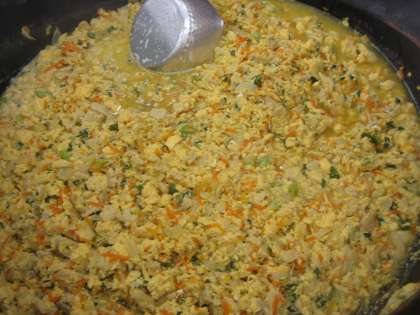 「親子煮」はだし汁に鶏肉・玉ねぎ・人参を柔らかく煮て、たくさんの卵を流し入れます。蒸すように火を入れて、最後に青ねぎを入れて仕上げました。とてもごはんが進みました。