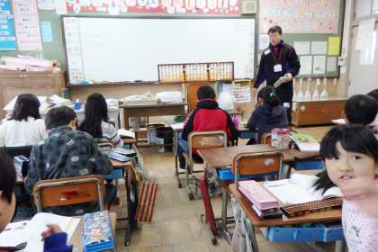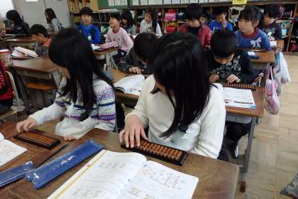 今,3年生はそろばんの学習中です。クラスでも習っている子が何人かいるため,その子が始めて学習する子にアドバイスを送っている場面も見られます。