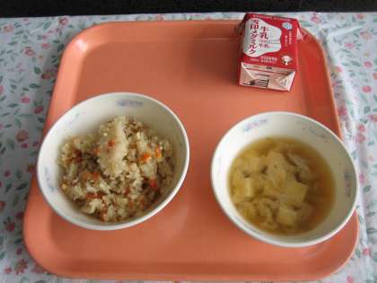「炊きこみ五目ごはん」は給食室でごはんを炊きました。