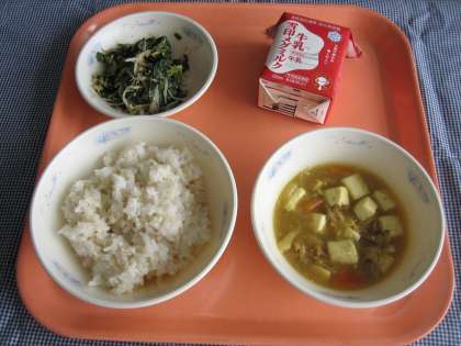 麦ごはん・牛乳・和風カレーどうふ・ほうれん草ともやしのごま煮