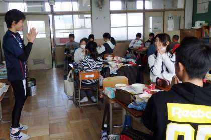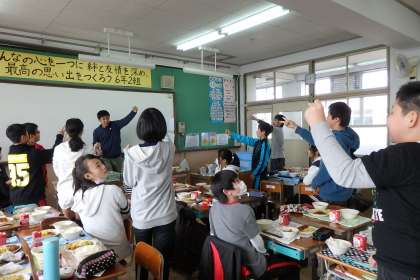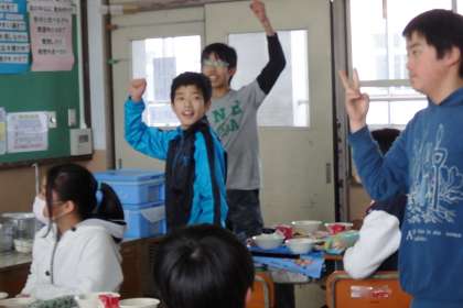 2組は,残ったカツを賭けたじゃんけん大会が行われていました。先生の音頭に合わせて,いざ勝負!カツの行方が決まったら,みんなで「いただきます!」