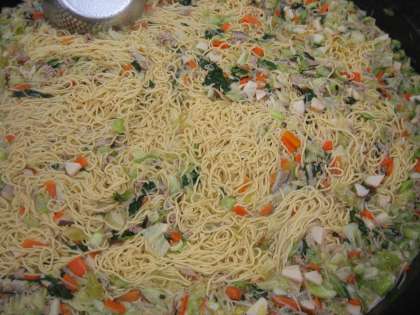 「チャンポン」とは、色々なものを混ぜ合わせるという意味です。本日の給食では、中華乾麺に豚肉・かまぼこ・人参・キャベツ・もやし・チンゲン菜・しいたけのたくさんの具で作っています。