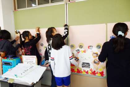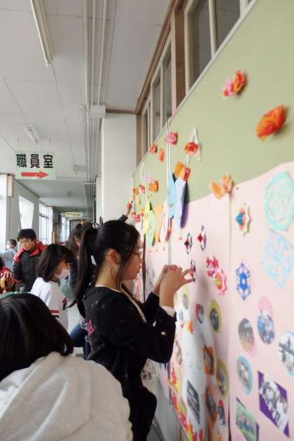 今まで,ノート名人やわくわく算数の掲示がしてあった職員室前ですが,卒業式・入学式用のお祝い掲示に一新しました。手伝ってくれたのは,廊下の清掃をしてくれていた6年生です。