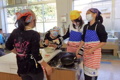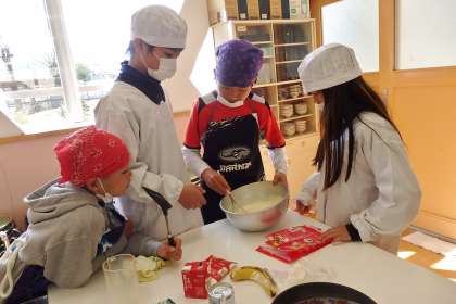 6年生は家庭科の調理実習でホットケーキ作りをします。今日は2組です。お昼過ぎ,5時間目から作りはじめました。食後のデザート作りです!