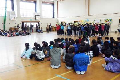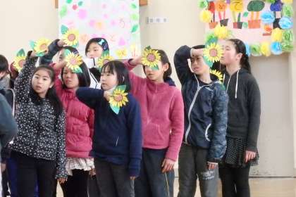 クライマックスでは,手作りのひまわりを高く上に掲げて,歌います。優しい詩にのせて,ひまわりがゆらゆらと揺れるようすは,見ていた子どもたちの心も揺らしたのではないでしょうか。