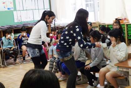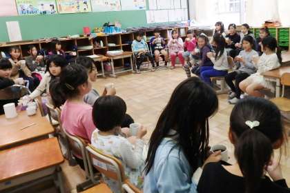 次は教室へ移動して,卒業公演のビデオを見ます。実際に自分たちの演技を振り返ります。ビデオを見た後は,感想を言い合いました。「良い演技ができて良かった」と,達成したことを話す子もいれば,来年度に向けての意気込みを話す子もいました。
