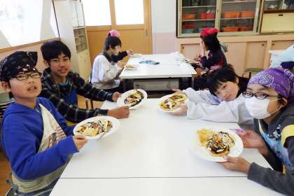 可愛くデコレーションしたら出来上がり!1組は,小さめのホットケーキを複数作った子が多く,サンドイッチのように具をはさんだり,顔を作ったり,シンプルで美味しそうな盛り付けがたくさんでした。