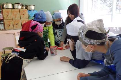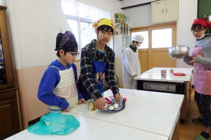 材料をもらったら,ホットケーキミックスの説明書とにらめっこして,手順をよく確かめます。まずは袋を切って生地作り!卵や牛乳を分量通りに混ぜ合わせていきます。