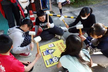 2枚目になると,児童会の子どもたちも作業に慣れてきて「せーの!」でタイミングを合わせ,リズムにのってトントントン……。はずむようにハンマーを叩く方が,簡単に叩けるとアドバイスをいただき,子どもたちの手際もよくなっていきます。その様子に下校途中の子どもたちも興味津々です。