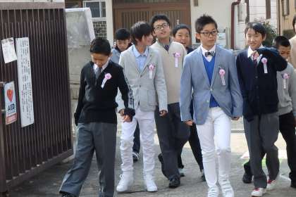 普段見慣れないスーツやブレザーで学校へやってきた子どもたちは,いつも以上に大人っぽく見えます。普段と違ったようすに,友だち同士少し照れ笑いを浮かべながら校門をくぐります。