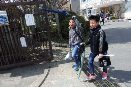 早咲きの桜がほころび始めた今日の昼。心地いい日差しの中,下校する子どもたちのようすです。これで今年度の授業は全て終わり。あと2週間後には,1つ学年が上がり,またちょっぴり成長した子どもたちにお会いすることになります。