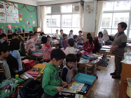 学びの川村先生が上着のたたみかたを教えてくれました。ランドセルの中身を出して,お道具箱の引き出しに入れて,机にしまいます。たったこれだけのことでも1年生の子どもたちは悪戦苦闘です。