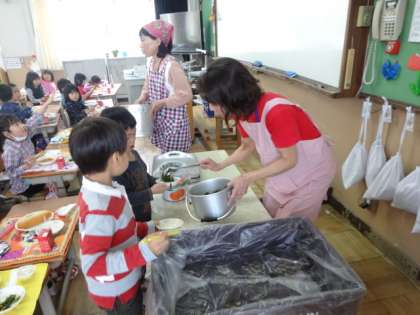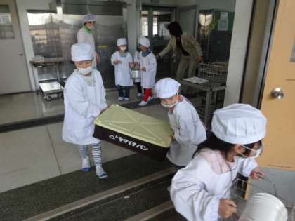 今年最初の給食でした。みんな待ちに待っていました。給食室には元気な「いただきます!」の声が響いていました。1年生にとっては梅津北小学校での初めての給食でしたが,「おいしい!」「おかわり!」の声でいっぱいでした。これからもおいしい給食をいただけるのが楽しみです。