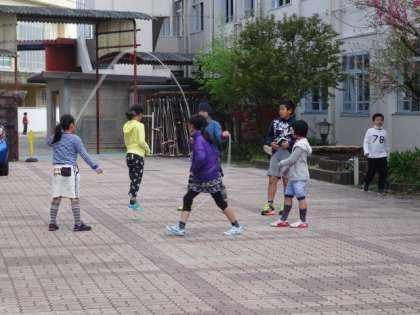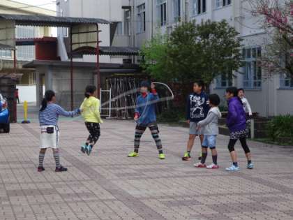 中庭では大なわを使って遊ぶ光景が見られます。しかも,なわを2本使ったダブルダッチ。2本のなわの間を上手にかいくぐり跳んでいます。なかなかにうまいです。低学年の人たちもあこがれの目で見ていました。
