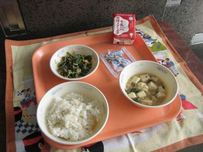 麦ごはん・牛乳・とうふのそぼろ煮・ほうれん草ともやしのごま煮・じゃこ