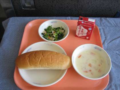 味つけコッペパン・牛乳・じゃがいものクリームシチュー・小松菜のソテー
