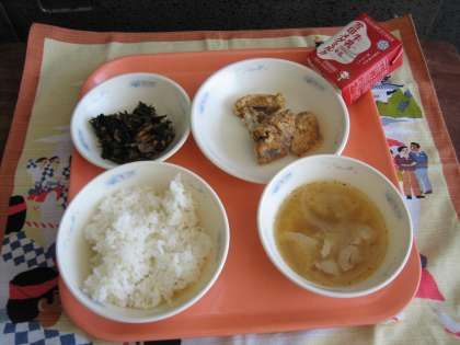 胚芽米ごはん・牛乳・あじのたつたあげ・ひじきの煮つけ・豚汁