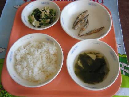 ごはん・きびなごのこはくあげ・小松菜とゆばの煮びたし・若竹汁