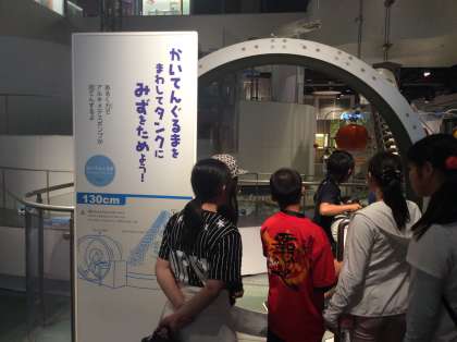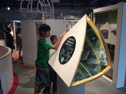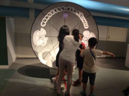 展示コーナーは科学の不思議がいっぱい。鏡の面白さ、音の反響、歩く力でポンプを回転させる不思議など。夢中になって遊んでいます。