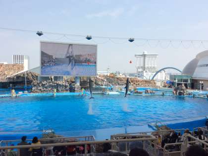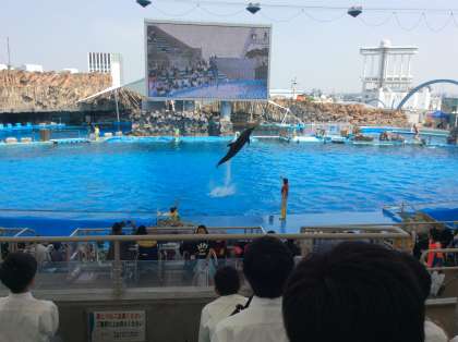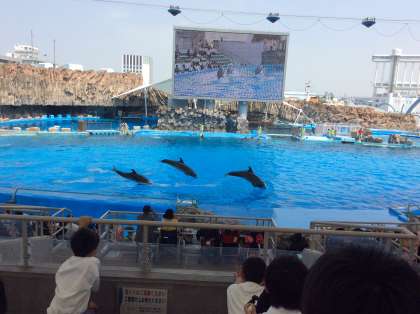 イルカのパフォーマンスも大技になってきました。輪くぐり、フリスビーキャッチなど、可愛く一生懸命の演技に拍手喝さいです。