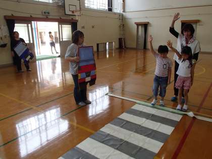 勉強のあとは地域の方や保護者のみなさんに先導役・車両役になってもらって実地訓練。