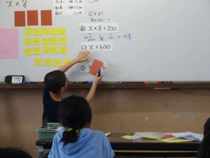 6年1組の教室で校内授業研究会を行いました。「文字と式」の単元で,式が表わしている意味について考えました。自分で考えたことを友だちと交流したり,自分の言葉で説明したりして理解を深めていきました。次回は5年生で,「式と計算」の単元で授業研究会を行う予定です。