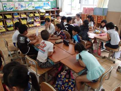 今日はなかよし集会。たてわり班ごとに担当の先生の教室に集まって,たてわり遊びの打ち合わせをします。