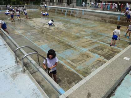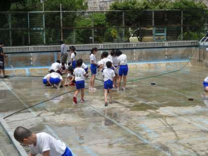 これからの水泳学習に向けて,プール清掃をしました。6年生が一生懸命プールの床や壁をみがいたり,ビート板を出したりしてくれて,あっという間に清掃が完了しました。また,地域の方も応援に駆けつけてくださり,大変助かりました。ありがとうございました。これで無事に水泳学習が迎えられます。