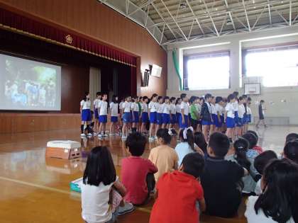 先頭を切るのは6年生。「ぞう列車がやってきた」というお話を,朗読と合唱で表現していました。最後に今月の歌「ともだちになるために」を全校で歌いました。