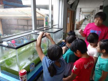 6月の委員会活動の様子です。飼育委員はうさぎがいる飼育小屋や,魚のいる水槽の掃除をしてくれました。環境委員は,節電を呼びかけるポスターを作成し,校内に掲示してくれました。