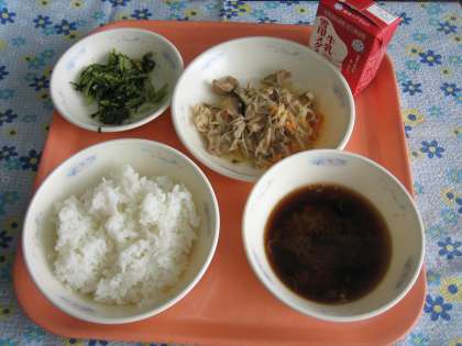 ごはん・牛乳・豚肉とこんにゃくのいため煮・だいこん葉のごまいため・赤だし