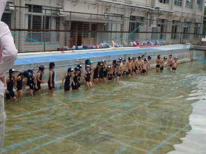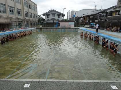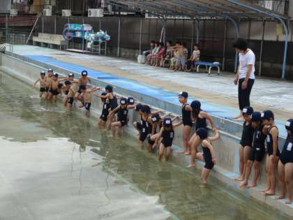 足洗い,腰洗い,シャワーの後は,いよいよプールへ。先生と入水するときの約束事などを一つ一つ確認しながら,プールに入っていきました。さすがにまだ水は冷たいようでしたが,でも初めてのプールに満足そうな表情の1年生たちでした。