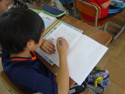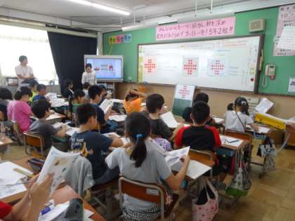 5年生の算数「式と計算」の学習を教職員で参観しました。自分で考えたことをペアで交流したり,クラスのみんなで話し合ったりしながら学習していきました。図を指し示しながら自分の言葉で一生懸命に考えたことを伝えあっていました。ノートにも今日の学習が振り返られるようにていねいにまとめることができていました。