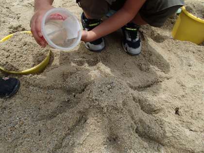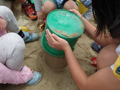 図画工作科で,「つちやすなとなかよし」という学習に取り組みました。カップやバケツ,スコップを使い,ちびっこ広場の砂場で造形あそびをしました。