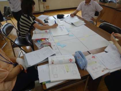 授業参観後は,教職員で事後の話し合いを行いました。教職員も小グループに分かれて,授業の良かった点,改善点について付箋を出し合いながら話し合いを進めていきました。教育委員会の特別訪問指導員の小西敏一先生にも来ていただきご助言をいただきました。子どもたちが主体的に学習に向かい,力をつけていくことができるように,今後も研究を進めていきます。