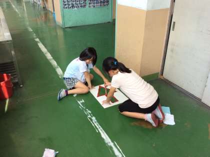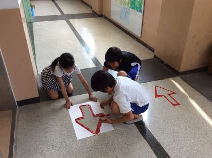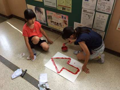 今日の放課後,広報委員会の人たちが,「廊下は右側を歩く」きまりを守りやすくするための印を描いてくれました。矢印の型紙を置き,赤いペンキで丁寧に塗っていきます。梅雨に入り,湿気が多くなると廊下が滑りやすくなります。右側歩行をみんなで守って,安全な生活を送りましょう。