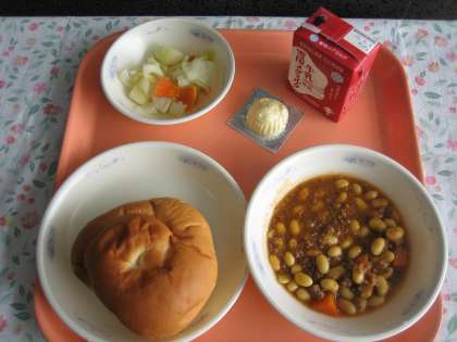 「チリコンカーン」は、アメリカの代表的な料理で「チリ」とも呼ばれています。ひき肉に豆や野菜を入れて煮込んで作ります。アメリカではインゲン豆を使って作りますが、給食では大豆を使って作りました。