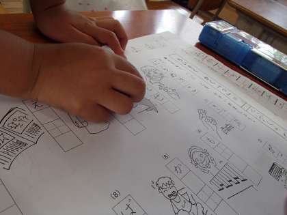 国語の促音「っ」のプリントをしていました。絵から言葉がなかなか出てこない子もいるのですが,絵と文字を結びつけることはこの学齢の子にとって非常に大切です。