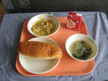 味つけコッペパン・牛乳・ソーセージと野菜のいためナムル・わかめスープ