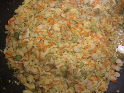 「ソーセージと野菜のいためナムル」は油で揚げたチキンフランクフルトとじゃがいもを、人参・キャベツ・きゅうりと一緒にサラダ油で炒め、砂糖・しょう油・米酢で味つけし、最後にすりごまを加えました。「ごま」の香ばしさや「お酢」のさっぱりとした味を楽しめました。
