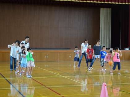 PTAのふれあい活動 ボール送り大会が体育館であり,たくさんの親子が参加しました。9つのチームに分かれて,それぞれチームごとに競い合いました。お互いに声をかけ合いながら,一緒になったチームメイトと頑張りました。