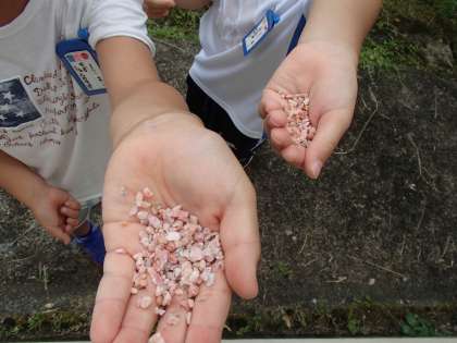 と見せに来てくれたのは,不思議なピンク色と白色の小さな石でした。確かに変わっています。