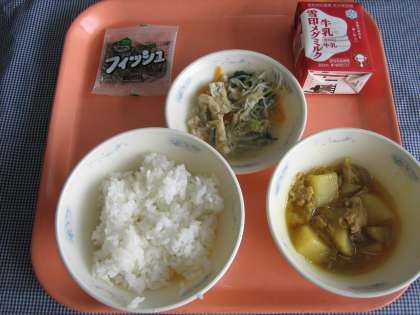 ごはん・牛乳・肉じゃが(カレー味)・もやしの煮びたし・じゃこ
