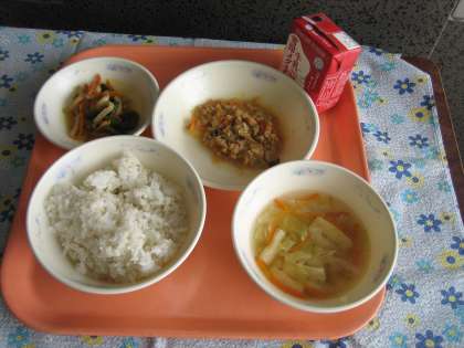 麦ごはん・牛乳・ツナそぼろ丼(具)・野菜のきんぴら・キャベツのすまし汁