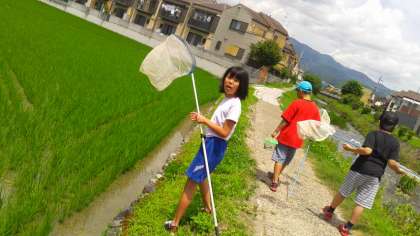 汗をいっぱいかいて暑いだけの散歩になったね、と言って学校に戻りかけたとき、1m以上もあるヘビの脱け殻を発見しました。それだけでも満足だったのですが、更にザリガニ2匹も捕まえ、大騒ぎです。