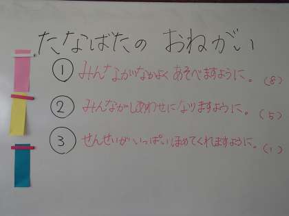 「明日の中間休みに取りに来ます!」広報委員会の子たちが,七夕の短冊を3枚置いて行ってくれました。各クラスで話し合いをして,3つのお願いを決めました。