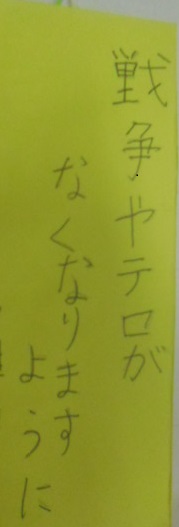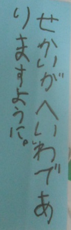 今日は七夕。笹飾りを作り、短冊に願い事を書きました。これまでは自分のことについての願い「〜がほしい」「〜になりたい」等という願いを書いていたのですが,今年は少し違っていました。「家族みんながこの1年間幸せになりますように。」 「世界が平和でありますように。」 「戦争やテロがなくなりますように。」と書いていました。さすが高学年,自分のことではなく、世界やみんなの平和や幸せの願いをもてるのですね!